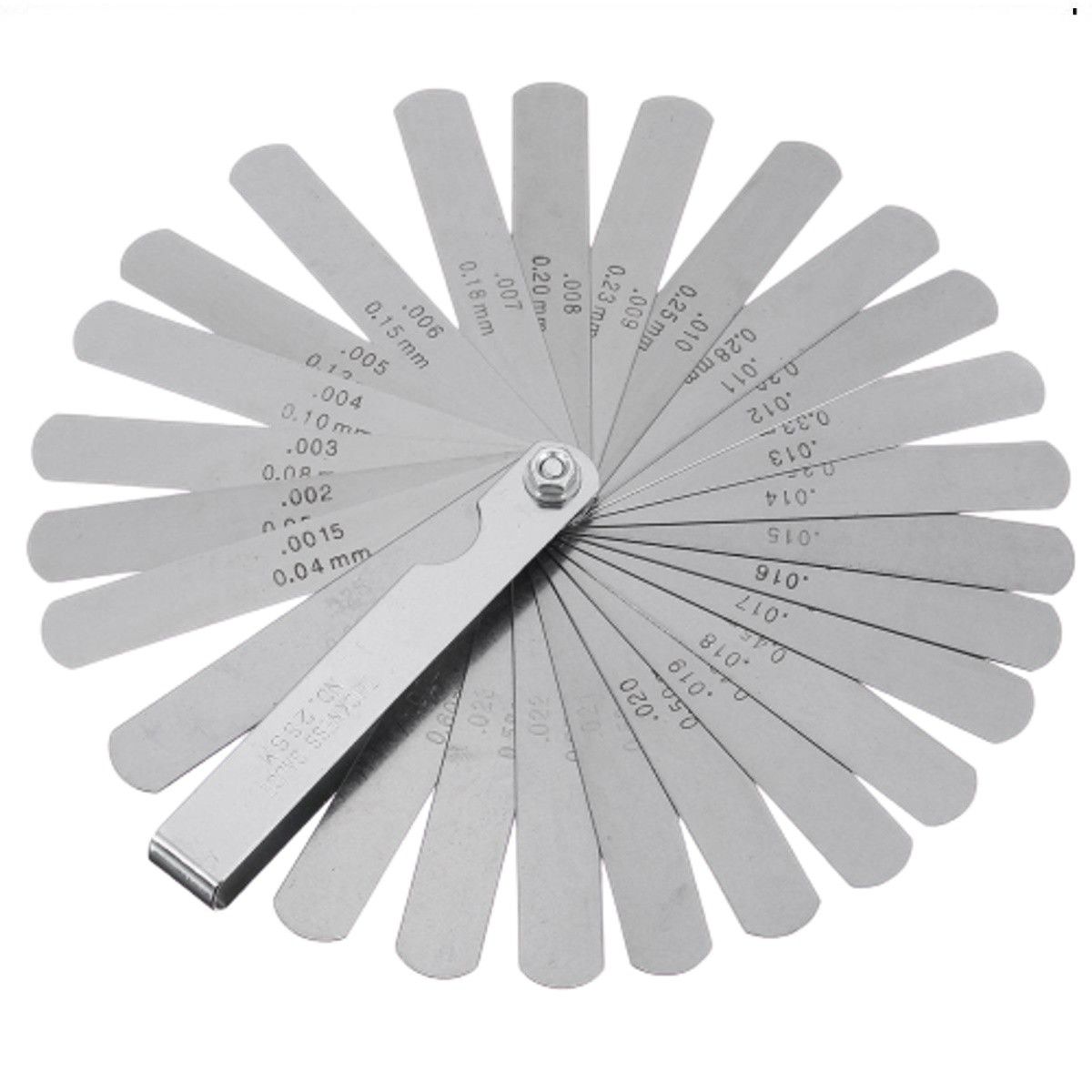 Calibre de folga 26 laminas, para comprovar e ajustar o espaço entre duas peças, como tolerância de válvulas, folga nas velas de ignição e contatos do distribuidor, lâminas de aço endurecido e temperado, gravadas com medidas em polegadas e milímetros, espessuras.